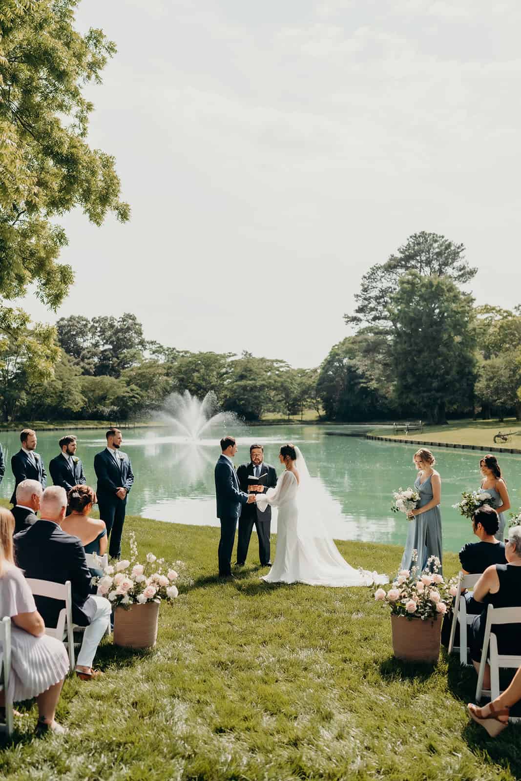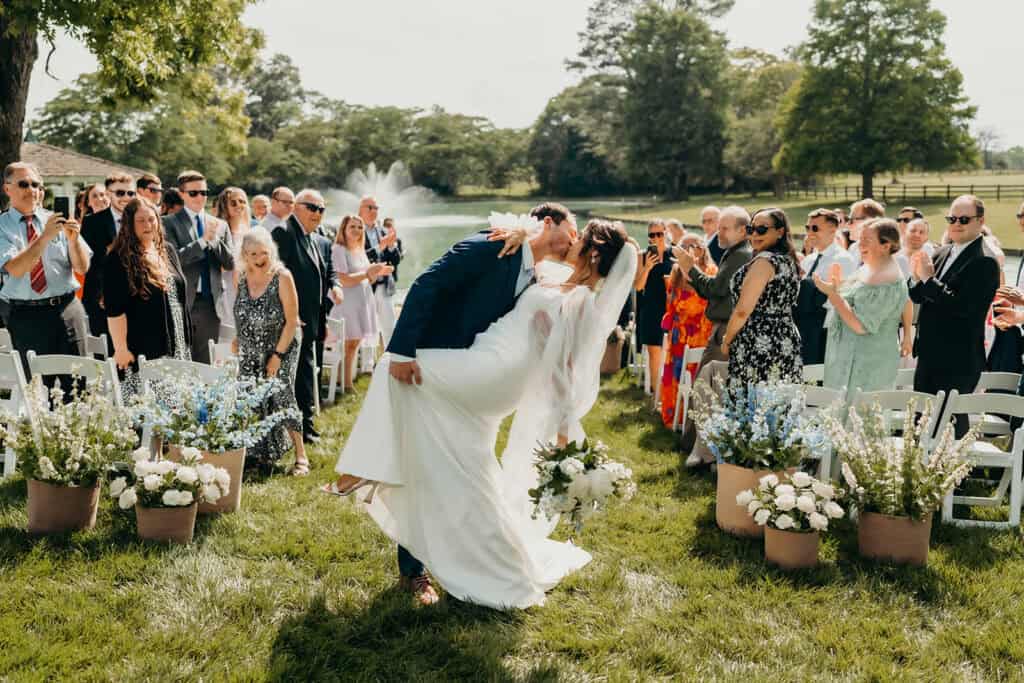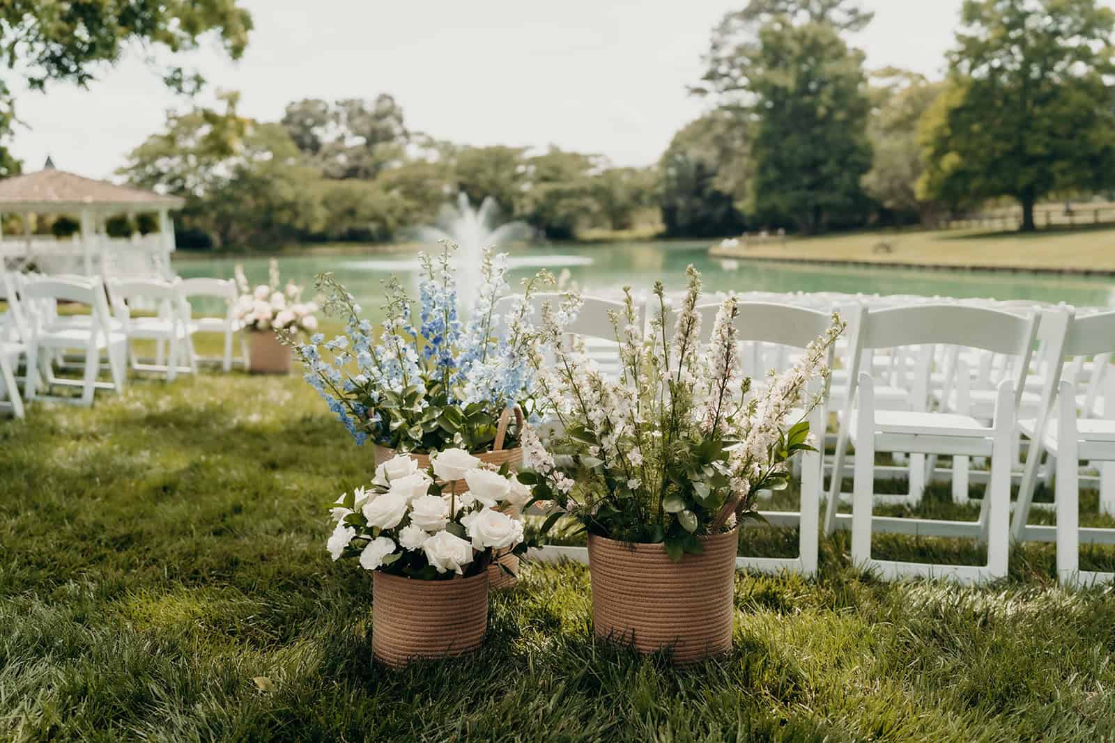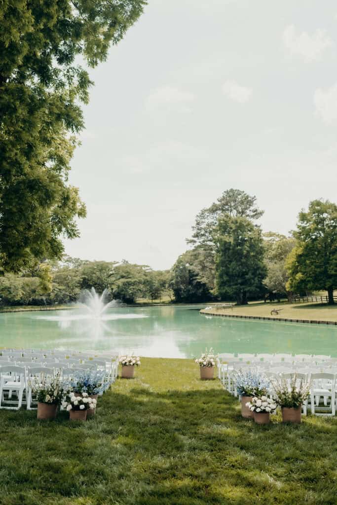 Rose Hill’s swan lake created a dreamy backdrop for the ceremony. Guests were welcomed by the fresh scent of flowers, with baskets of blooms lining the aisle in a display that was as fragrant as it was beautiful. A live cellist filled the air with music, creating an atmosphere that felt both intimate and unforgettable as Jenna walked down the aisle to meet her groom.