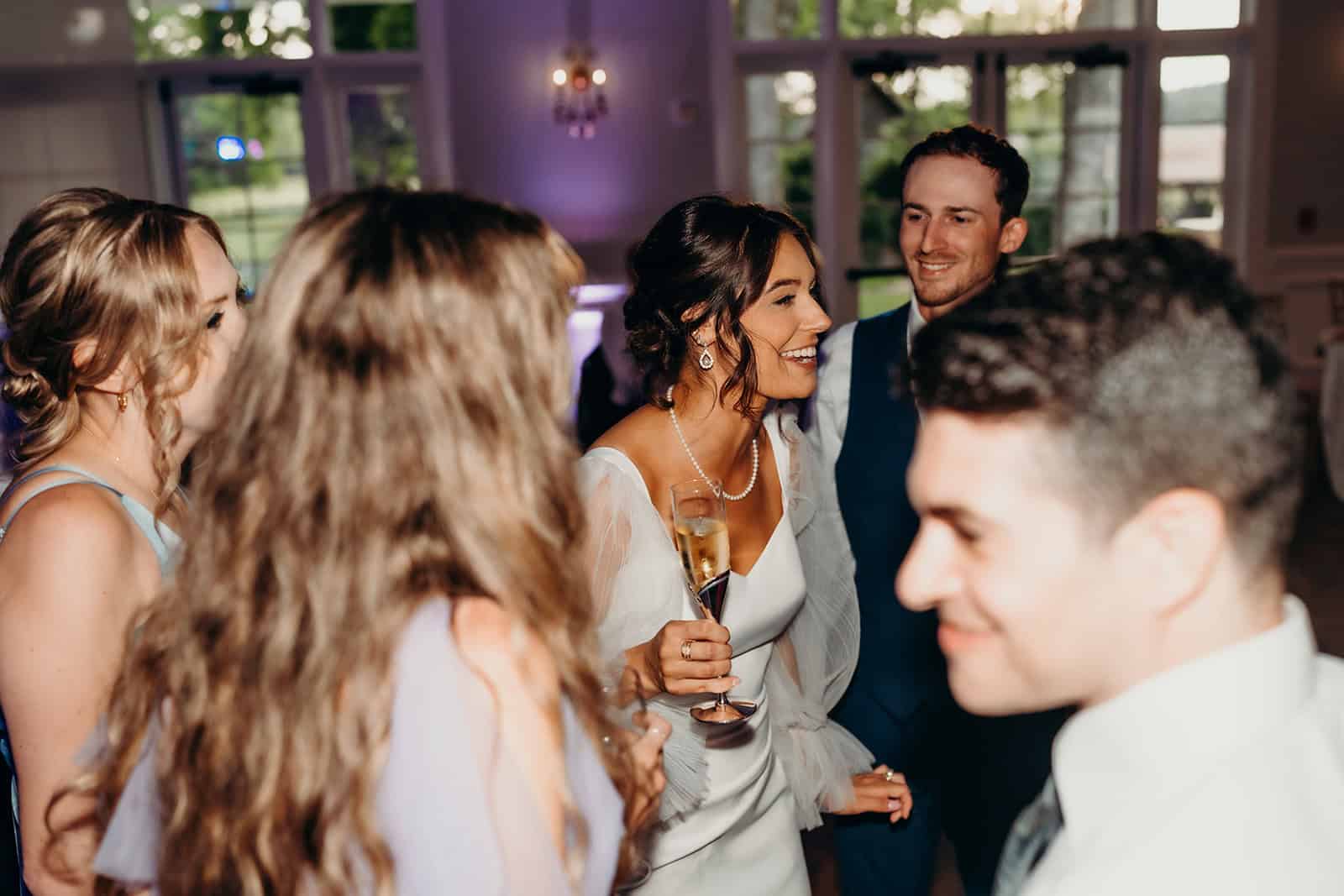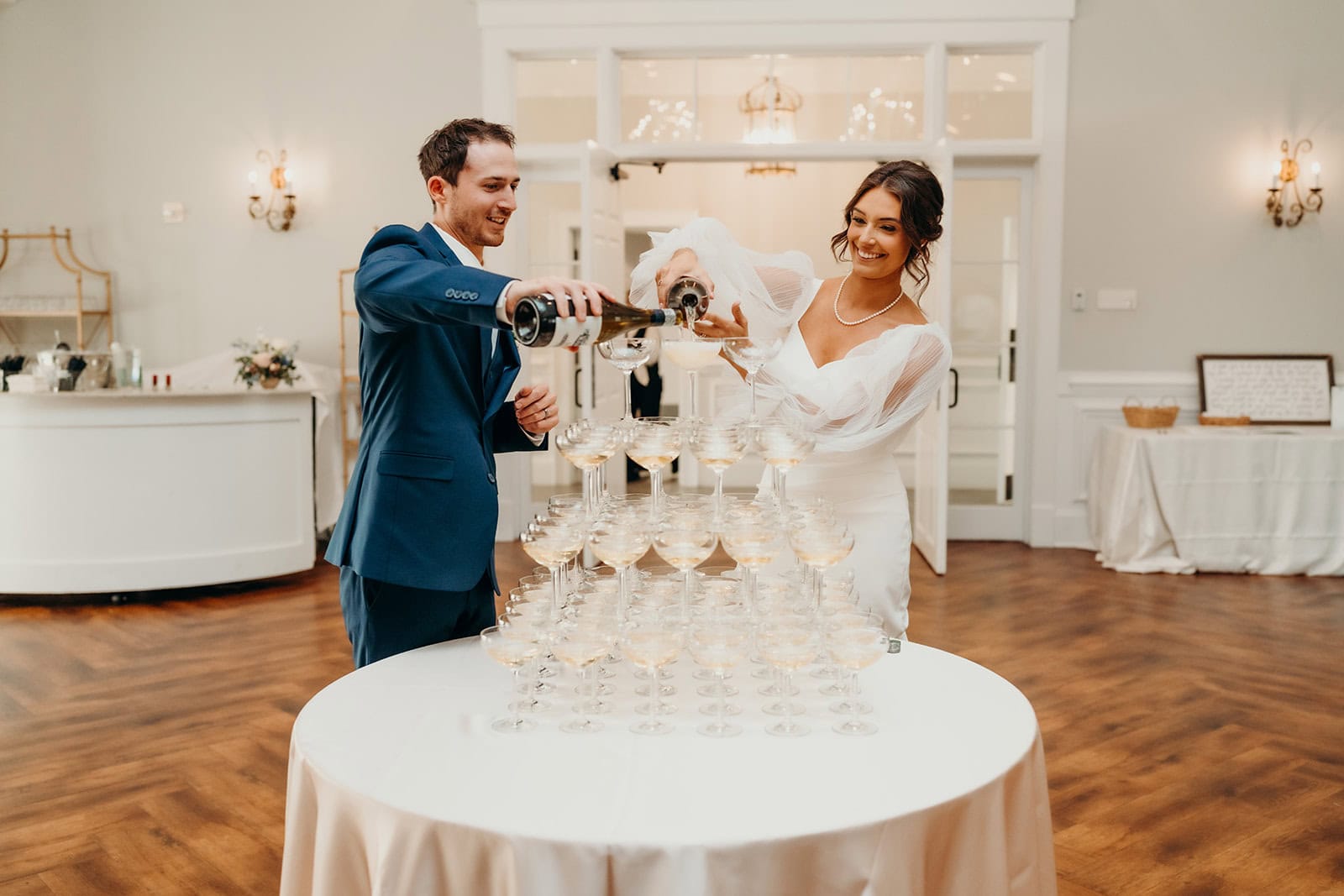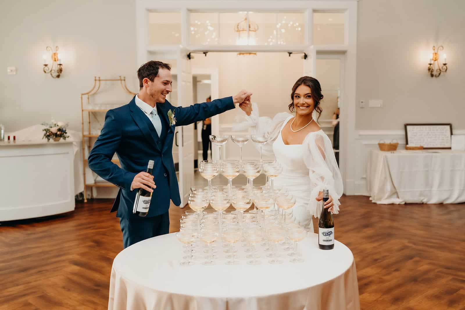 When it was time to celebrate, the newlyweds led the way into Nathan Hall—Rose Hill’s glamorous ballroom—with a champagne tower grand entrance that wowed their guests. All were treated to a three-course dinner before hitting the dance floor, where the night came alive with energy, laughter, and plenty of moves to remember. It was the perfect finish to a day that balanced elegance, emotion, and fun in all the best ways.
